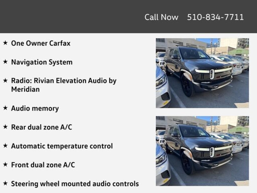 One Owner Carfax, 3rd row seats: bench, 7 Seat Interior, Audio memory, Automatic temperature control, Emergency communication system, Exterior Parking Camera Rear, Front dual zone A/C, Fully automatic headlights, Memory seat, Navigation System, Perf Vegan Leather Seat Trim w/Patterned Stitching, Radio: Rivian Elevation Audio by Meridian, Rear dual zone A/C, Steering wheel mounted audio controls, Ventilated front seats, Wheels: 20" All-Terrain Machined Aluminum.